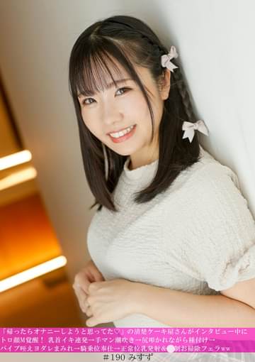 ネット番組のインタビュー協力してくれる女性を探しています!街ゆく美人の日常を聞かせてもらうダラダラトーク聞かせて下さい!清楚そうで優しい雰囲気が溢れている美人さん。普段はケーキ屋さんで働くおしとやか系だけどお酒は大好き!彼氏は全然出来ないけどエッチ出来る人がいたら勿論ヤリたいし興味ありまくり☆性癖はMだから相手が喜んでくれるなら何でもしちゃう!そして実はセフレ有り!だけど彼氏と被っちゃうから秘密にしてます。エッチしたのは1週間前だからたまってきちゃって帰ってオナニーしようと思ってたとのこと…。持ってる玩具は電マとウーマナイザーとバイブ!オナネタはエロ動画みたり、エロ漫画みたり。セフレとのセックス音声を聞きながら妄想したり。秘密のエピソードはバートイレで飲み会してる最中にトイレでヤッちゃった!って隠れビッチな話を聞いてたらフル勃起しちゃったので見せつけたら即手コキしながら嬉しそうな顔しちゃってM顔してる。キスしたらもっとトロトロしたエロい顔に変わっちゃって天然で超興奮させる女です☆形のいい綺麗な乳首が超敏感で感じまくり!乳首だけでイッちゃう女に出会ったのははじめてです!手マンで潮吹きながらイキまくってチ◯ポ欲しがりまくる女。尻を叩かれながらピストンされて気持ちいい連発しながら脳イキする変態M女にがっつり中出し!まだヤリたりないこの女はまだ帰らくて大丈夫って2回戦目したいって(笑)バイブ咥えさせたらヨダレ垂らしてジュボジュボに舐めまくり。ヨダレまみれのバイブで乳首責めしてから挿入してあげたらさっきの中出し精子出てきちゃったじゃん☆エロすぎるギャップでフル勃起中の肉棒を根本まで舐めさせてまた生挿入!乳首舐めながら騎乗位奉仕させて膣奥までずっとハードピストン!正常位で見つめ合いながら乳発射してそのままお掃除フェラフィニッシュ!
